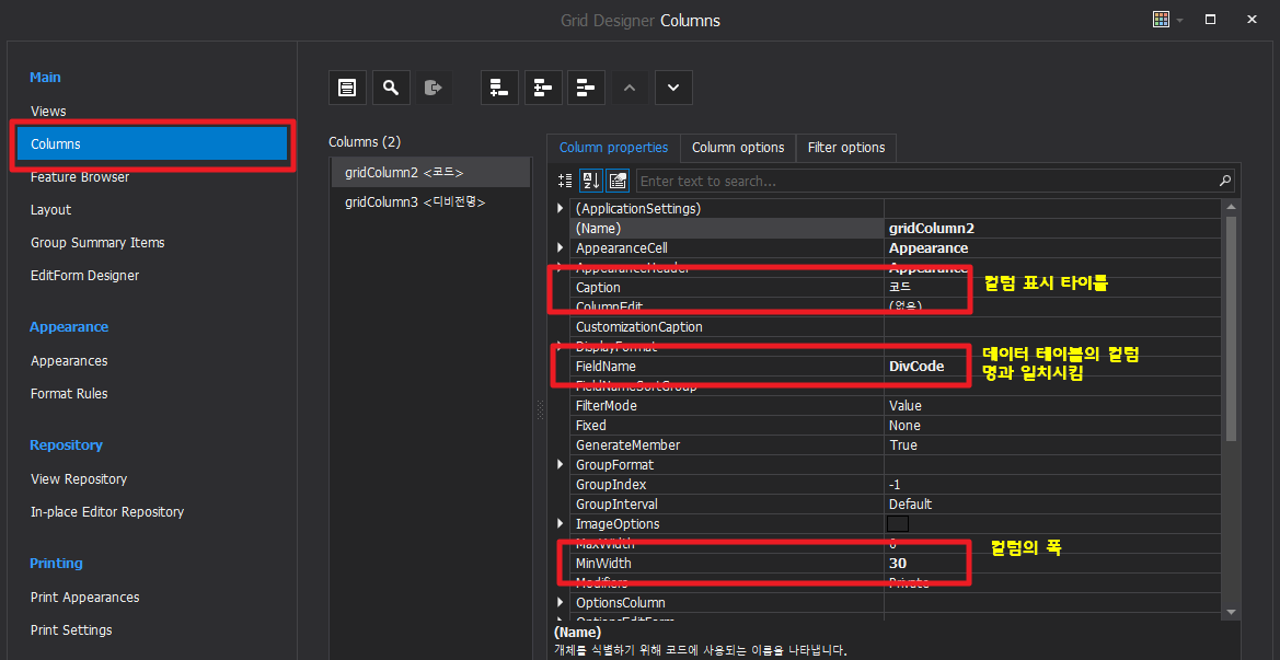 바인딩한 테이블과 보여줄 컬럼을 맞추기