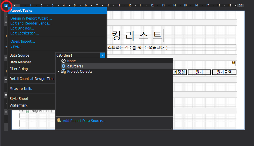DevExpress/Reporting 리포트 파일에 DataSet 연결 by 하_늘_바_람 2021. 11. 11. 상단의 붉은 원을 클릭해서 데이터소스를 선택하면 됨. 공유하기 게시글 관리 cODELESs